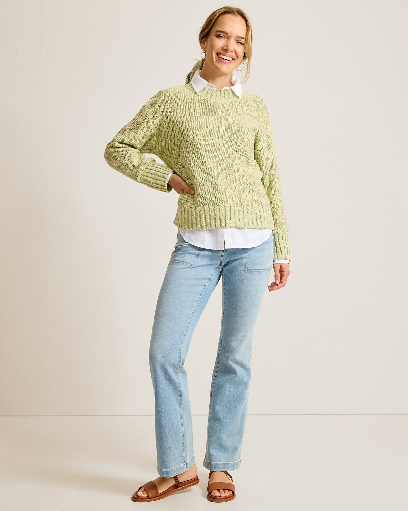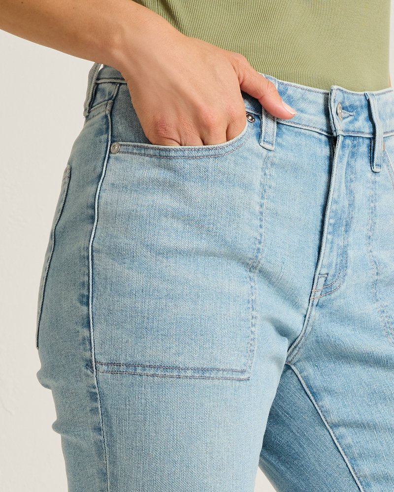 • Mid-rise style fitted through the leg with a slight flare toward the hem.