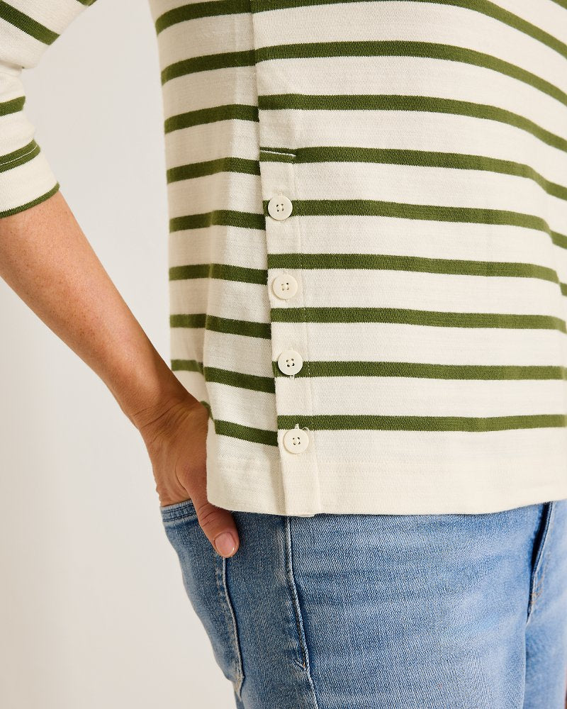 An easy 3/4-sleeve silhouette with a classic stripe design earns even more style points with chic side-button details, adding interest to an otherwise simple tee.